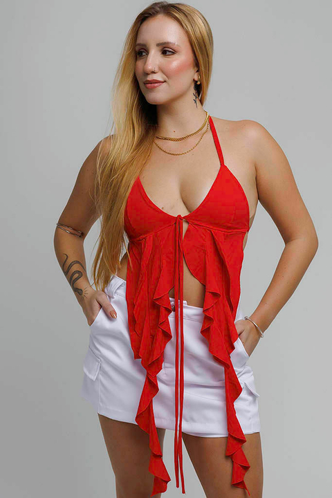 Transforme seu visual com o Cropped Zurick! Este modelo deslumbrante, confeccionado em poliamida, combina leveza e descontração, sendo perfeito para diversas ocasiões. Com detalhes em babados e a opção de amarrar na frente, ele traz um charme único ao seu look.